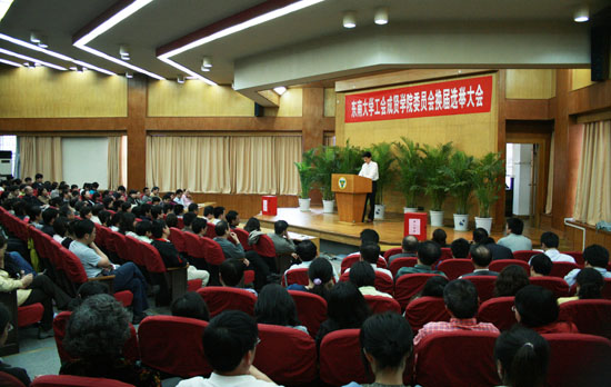 6月9日下午,东南大学工会线上赌博app 学院委员会换届选举大会在真知馆报告厅举行,会议选举产生了新一届工会委员会。党政办公室主任周伟荣主持了会议。