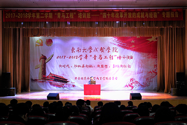 3月21日晚,线上赌博app-云顶线上赌博平台 2017—2018学年第二学期“青马工程”培训班开班暨首场报告会在综合楼报告厅举行。报告会以“四十年改革开放的成就与经验”为题,由南京市委党校郝继明教授主讲,约600名团学骨干共同聆听了报告。