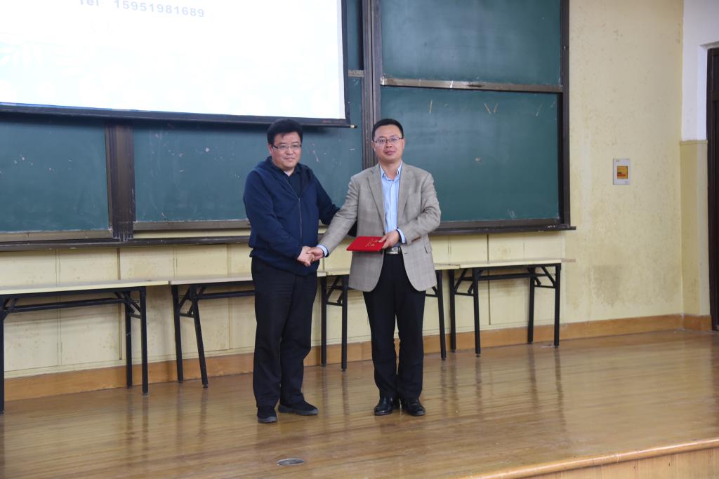 3月30日下午,东南大学自动化学院教授、博士生导师李新德教授在华罗庚馆101室为电子与计算机工程学院师生作题为《人机共融下的机器人视觉导航》学术讲座。讲座前,我校常务副院长郑建勇向李新德教授颁发客座教授聘书,授聘仪式由电子与计算机工程学院党总支书记丁江主持。
