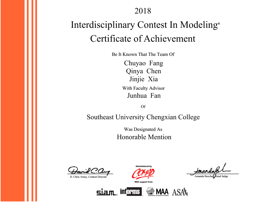 日前,2018年美国(国际)大学生数学建模竞赛(MCM/ICM)成绩揭晓,由基础部范俊花老师指导的电子与计算机工程学院2015级自动化专业房楚尧、夏金杰和经济管理学院物流管理专业陈沁雅三名同学的参赛作品获得ICM竞赛的Honorable Mention(国际二等奖)1项,这是我校首次在该比赛中获得奖项。