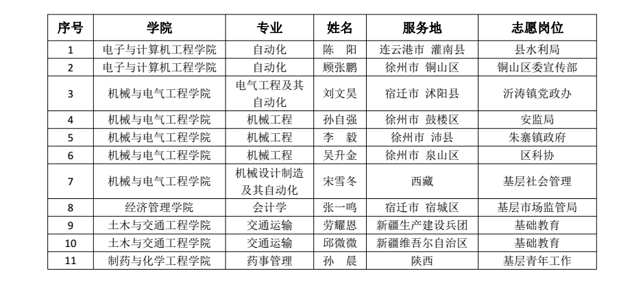 我校历来高度重视志愿服务工作,校团委将协同就业办进一步以“精准设计、精心服务、精品建设”为主线,加强对毕业生参加国家志愿服务工作的制度保障、政策引导。今年我校“两个计划”共有25人参加面试,最终11人通过面试,其中西部计划4名,苏北计划7名。之后,我校志愿者们将背上行囊,在新疆、西藏、陕西及苏北各市参加1-2年的志愿服务。