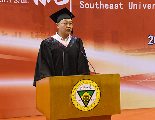 毕业生代表2014级环境设计专业2班陈康帅同学深情回忆了珍贵的大学时光,代表全体毕业生感谢母校为学生们创造了全方位的成长成才平台,并表示将不负老师和母校的期待,“求真求美,成人线上赌博app ”,真正做到,今日我以线上赌博app 为荣,明日线上赌博app 以我为荣。
