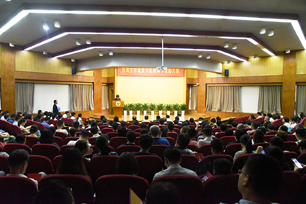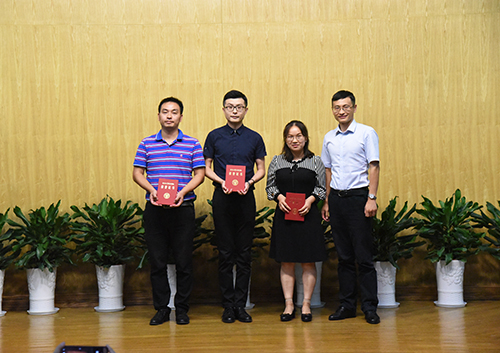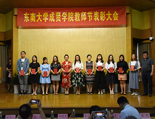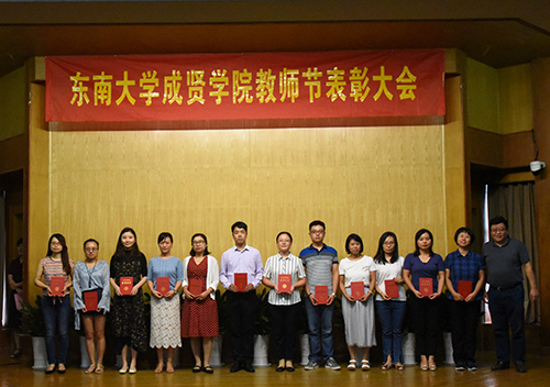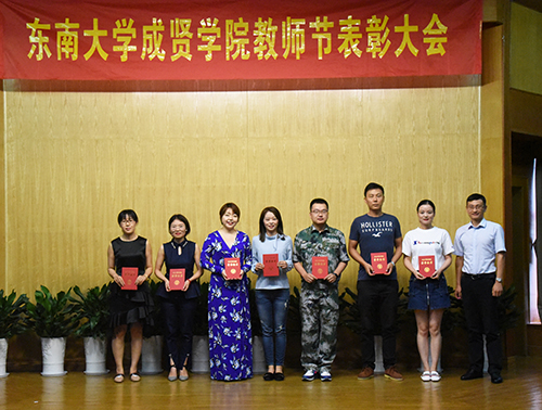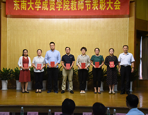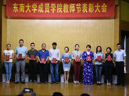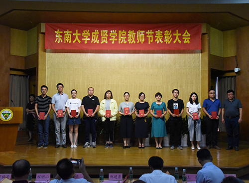 会上,董梅芳副院长宣读了学校教职员工在2017—2018学年获得的各类奖项。学校领导分别为获奖先进集体和个人颁发证书,并与他们亲切合影。东南大学杰出校友彭山宏先生在我校设立了“美达灌装机械”奖教金和奖学金,奖励我校机械与电气工程学院的优秀教师和学生,并现场为获奖教师进行奖教金颁奖。