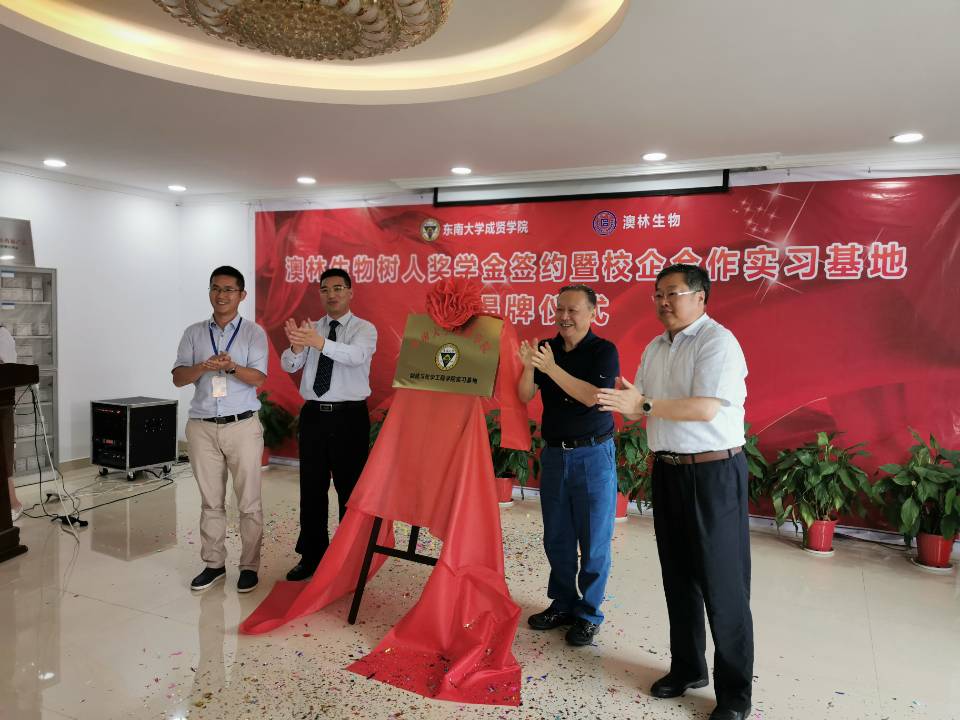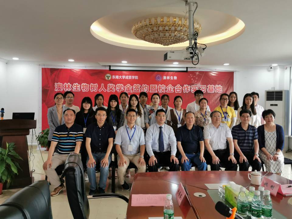 6月20日,线上赌博app-云顶线上赌博平台 “澳林生物树人奖学金”签约及校企合作实习基地揭牌仪式在南京澳林生物科技有限公司举行。线上赌博app 学院院长顾问程明山、党政办主任周伟荣、组织人事部部长姜宁光、制药与化学工程学院院长林保平、制药与化学工程学院党总支副书记周继荣、制药与化学工程学院“东大—线上赌博app ”科技创新平台主任姚刚,南京澳林生物科技有限公司总经理曾宪亮、副总经理张爱红、技术总监路爱成及部分中高层技术骨干出席了签约仪式。