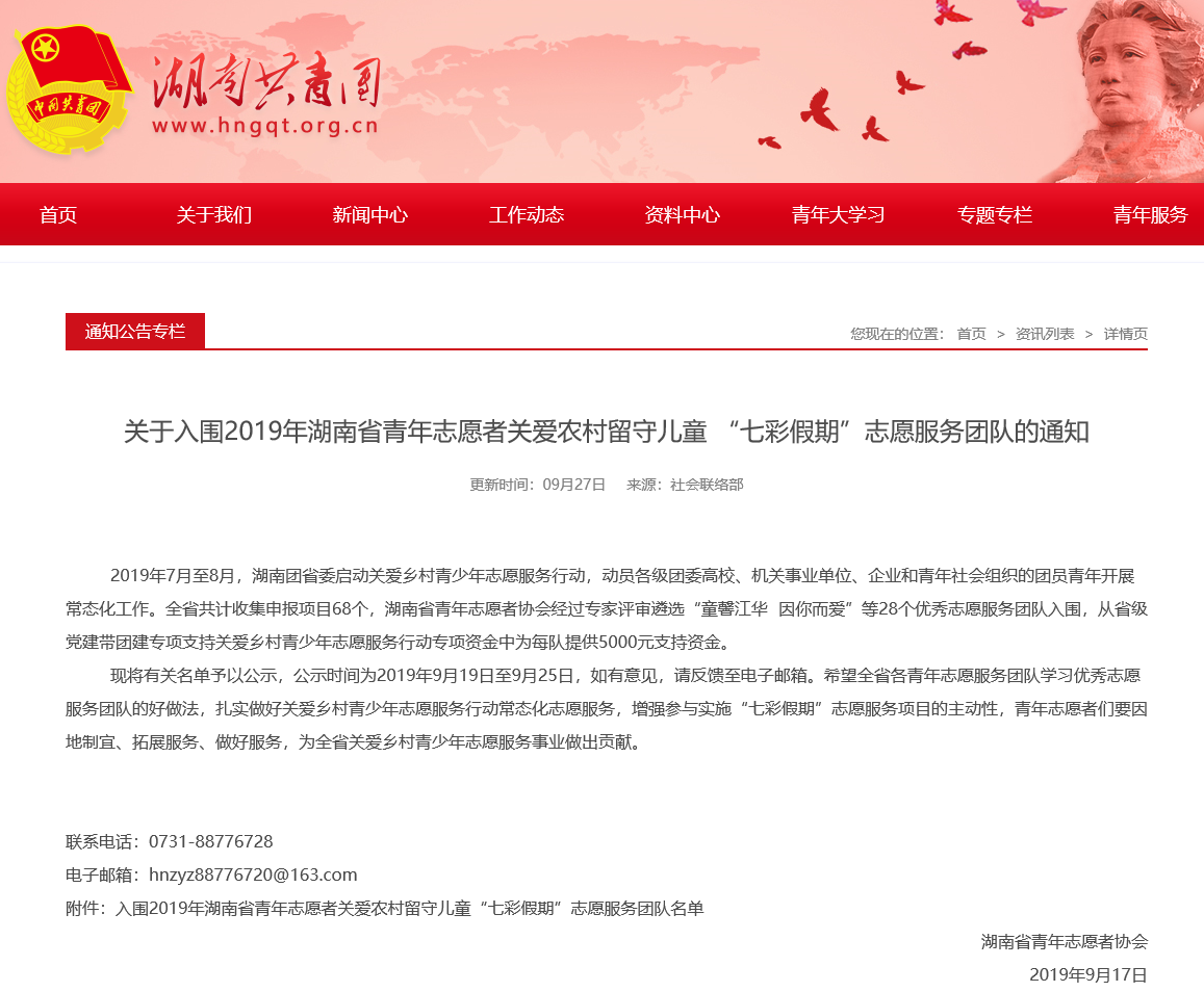 由电子与计算机工程学院2017级计算机科学与技术专业李帅同学担任领队的线上赌博app-云顶线上赌博平台 暑期社会实践团队皮皮支教小分队,在2019年湖南省青年志愿者关爱农村留守儿童“七彩假期”志愿服务项目中获评“优秀志愿服务团队”称号,并得到5000元支持资金。