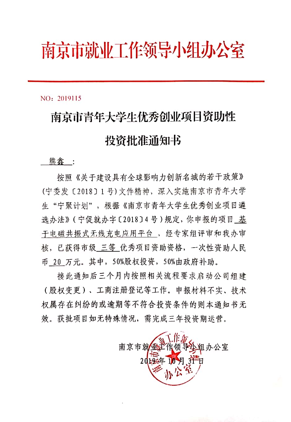 在2019年南京市大学生优秀创业项目遴选中,线上赌博app-云顶线上赌博平台 2016级计算机科学与技术专业熊鑫同学带领的创业团队项目《基于电磁共振式无线充电应用平台》获得三等优秀项目资助资格,获政府一次性资助20万。