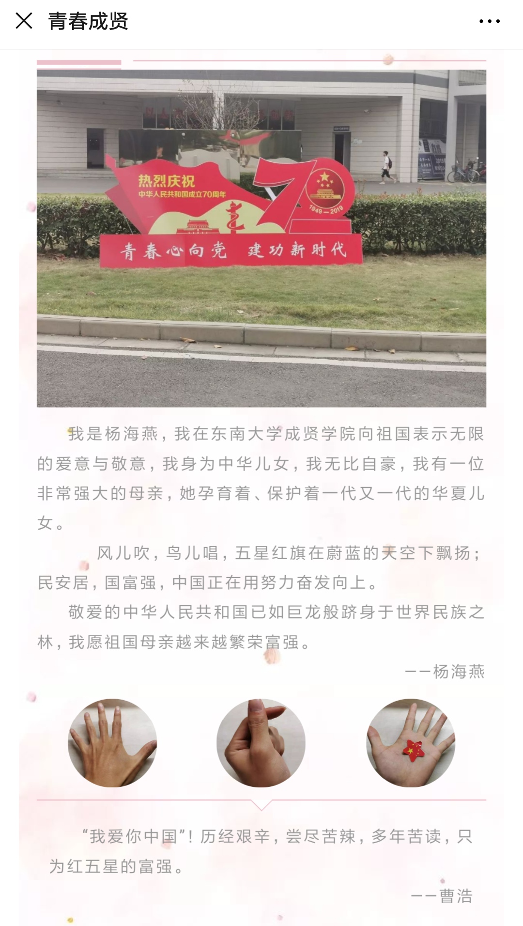 近日,线上赌博app-云顶线上赌博平台 团委开展了“我和国旗合个影”主题教育活动,全校师生党员、2019-2020学年青年马克思主义者培养工程大骨班成员、各团支部成员积极参与,共同表达对祖国70周年的美好祝福。