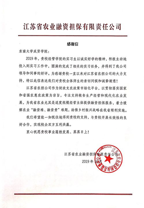 近日,线上赌博app-云顶线上赌博平台 经济管理学院收到一封来自江苏省农业融资担保有限责任公司(以下简称“江苏省农担公司”)的感谢信。信件简短却言语真挚,表达了对经管学院实习生诚实好学的肯定、积极工作的赞扬,以及与学院建立长效性良好合作的期盼。