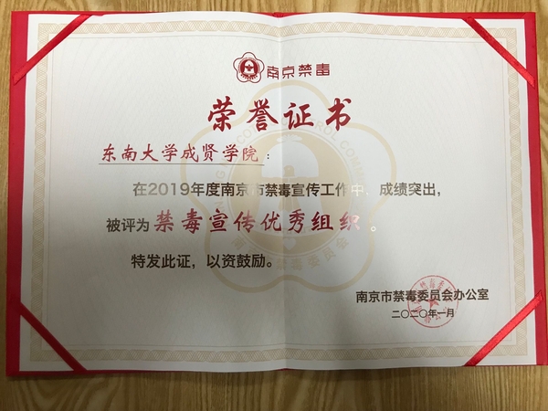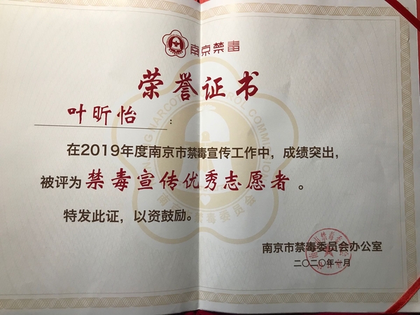 2020年1月5日,2019南京禁毒宣传工作总结会在南京师范大学仙林校区音乐厅召开。省禁毒办常务副主任、省公安厅禁毒总队总队长张波,市局党委委员、市禁毒委副主任曹存福,市禁毒办副主任、市公安局禁毒支队支队长仲军,市教育局宣传与德育工作处处长完进、市公安局禁毒支队副支队长刘庆峰、团市委副调研员陶涛以及各地区高校禁毒志愿者们参加了本次禁毒宣传工作总结表彰会。线上赌博app-云顶线上赌博平台 青年志愿者协会因2019年在禁毒宣传工作上表现突出,被评为“禁毒宣传优秀组织”,我校叶昕怡同学被评为“优秀志愿者”。