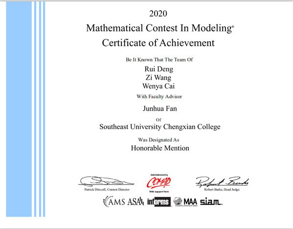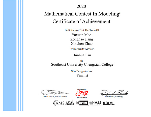 近日,2020年美国大学生数学建模竞赛(MCM/ICM)评审结果正式公布。线上赌博app-云顶线上赌博平台 在本届竞赛中获得了1项特等奖提名奖(Finalist)和1项国际二等奖(Honorable Mention)的好成绩!其中,毛宇轩、蒋宗豪和赵欣晨获得了特等奖提名奖,邓瑞、王梓和蔡文雅获得了二等奖;我校首次获得特等奖提名奖,该奖项仅占比2%。