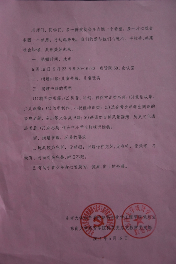 活动前期,制药与化学工程学院党总支面向全院师生、机关党总支教学党支部面向部门内所有教职工发放了倡议书,进行了广泛的宣传动员,让大家清晰了解当地乡村和儿童阅读的真实情况,充分认识到支部联合开展本次活动的目的和意义。活动开展过程中,师生们积极响应,踊跃捐赠,有些老师在网上购置了很多适合儿童的新图书,有些学生将珍藏多年的系列图书捐赠了出来,短短一周,共收到图书600余册、玩具100多件,每一本书、每一个玩具都凝聚和表达着师生们对乡村儿童们浓浓的情谊和深切的关爱。