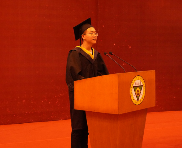 毕业生代表2017级软件工程专业4班耿飚同学代表全体毕业生向辛勤培育学子的领导、老师们表示衷心的感谢。展望未来,他踌躇满志:在奔赴前程之时,大家会始终不忘初心,怀揣最初的理想信念坚定地前进;面对挫折与困境之时,能够始终牢记 “求真求美,成人线上赌博app ”的精神,砥砺奋进、不畏艰难;努力做到今天我以线上赌博app 为荣,未来线上赌博app 以我为荣。