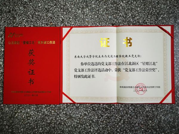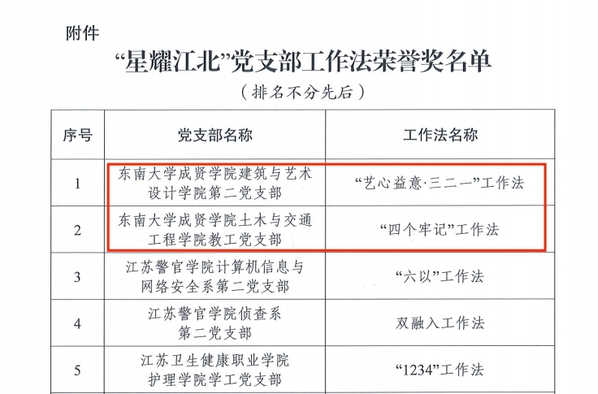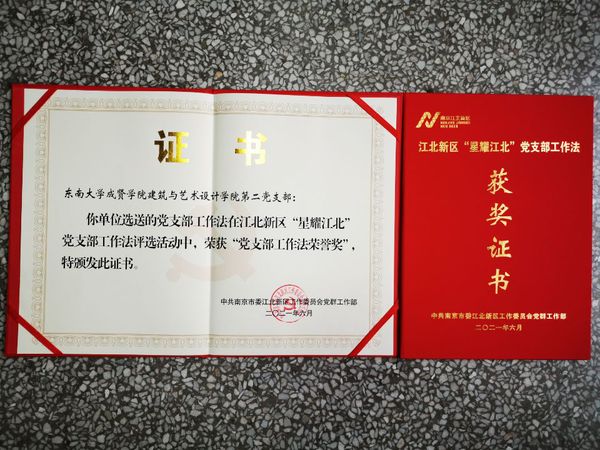 为深化党建强基系列行动,真正把党建基因融入江北新区发展血脉,进一步发挥基层党组织战斗堡垒作用和党员先锋模范作用,我校推选的建筑与艺术设计学院第二党支部“艺心益意·三二一”工作法和土木与交通工程学院教工党支部“四个牢记”工作法在江北新区此次“星耀江北”党支部工作法评选活动中双双获奖。