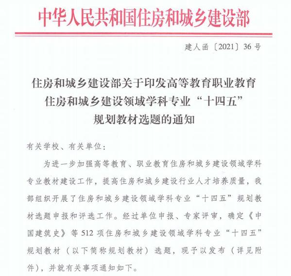 此次“十四五”规划教材选题申报和评选工作是住建部为了进一步加强高等教育、职业教育住房和城乡建设领域学科专业教材建设工作,提高住房和城乡建设行业人才培养质量,面向全国高等教育、高等职业教育、中等职业教育单位征集选题,吸引了来自清华大学、东南大学、浙江大学、同济大学等全国知名高校的住房和城乡建设领域学科专业的专家和学者申报,最终确定高等教育类、高等职业教育类、中等职业教育类共计512项选题,我校是全国高等教育类单位中唯一获得住建部“十四五”规划教材立项的民办高校。