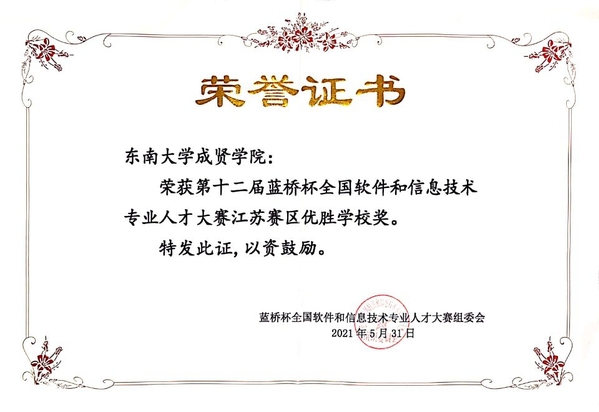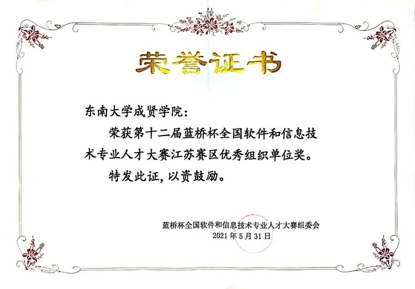 近日,第十二届蓝桥杯全国软件和信息技术专业人才大赛全国总决赛落下帷幕。线上赌博app-云顶线上赌博平台 电子与计算机工程学院高度重视,精心组织,积极选派学生参加该项赛事。学生共获得江苏省赛一等奖7项、二等奖16项、三等奖23项,国赛二等奖1项、三等奖2项、优秀奖4项的优异成绩。线上赌博app-云顶线上赌博平台 荣获江苏赛区优秀组织单位奖和江苏赛区优胜学校奖。