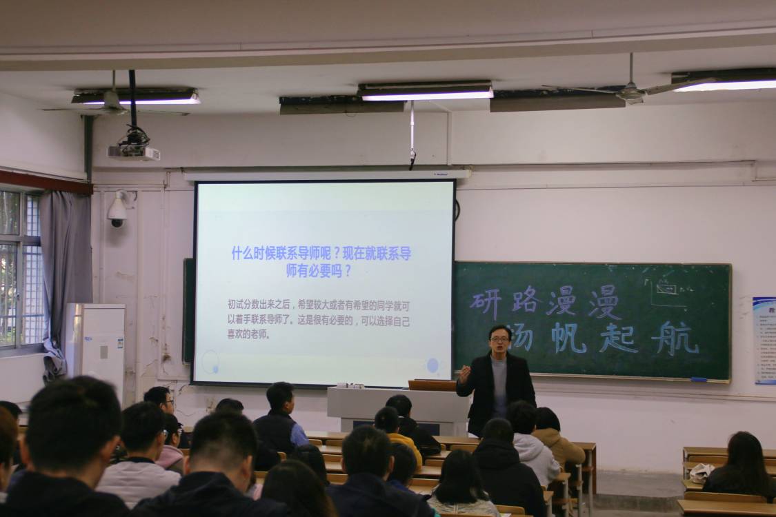 在此次讲座中,张一卫教授为同学们指明了考研之路。首先,张教授讲解了研究生考试的考核形式和考试难度,以东南大学、常州大学、南京工业大学的院校招生专业目录为例,强调了专业课程在考研中的重要地位。其次,张教授向同学们分享了考研相关科目的复习方法,依次指出在政治英语和数学三门公共课以及专业课程的复习中需要注意的各个方面。张一卫教授从考生的角度出发,提出了选择导师的三个方面和联系导师的方式。最后,张教授从学习和生活两个方面给同学们提出了真挚的建议,鼓励同学们奋发进取,砥砺前行。