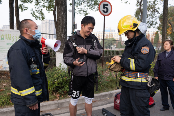 11月29日,消防器材及实景体验活动在食堂前主干道开展。通过VR体感等现代信息技术,师生现场体验了不同场景、不同火场的灭火实操以及破拆抢险逃生,通过真实的场景模拟,增强了师生的代入感与实操感,更好的掌握了消防器材的使用方法及处置初期火灾、逃生自救的能力。南京消防泰山中队的队员现场介绍了部分应急救援设备。