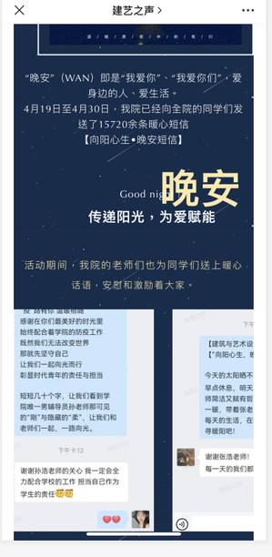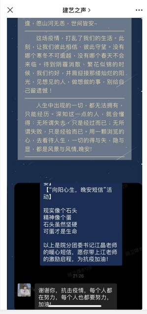 实行疫情防控“三个一”工作法。建立一种网格化管理,保障疫情防控工作落细落实;保持一个品牌化活动,推出“小白姐的下午茶”,与学生充分交流,引领正确价值观,积极发挥学生干部作用,形成防疫合力;形成一支心理疏导队伍,运用“建艺之声”公众平台开展“向阳心生,晚安短信”,面向全院师生征集15720余条暖心短信,每晚统一整合发给全院师生,分享成长经历及人生感悟,交流学习方法与人生规划,帮助大家明晰未来方向和坚定理想信念,共同守护校园生活。