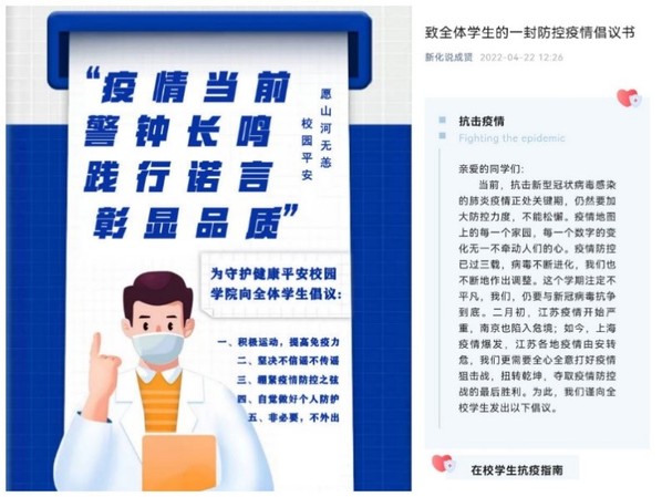 疫情防控宣传与倡导。为落实疫情防控的政策,坚持上下协同、一致抗疫的要求,学院发出倡议宣传书,发布疫情防控知识微信公众号推文,加强疫情防控的宣传与倡导,增强同学们的疫情防控意识和责任感。