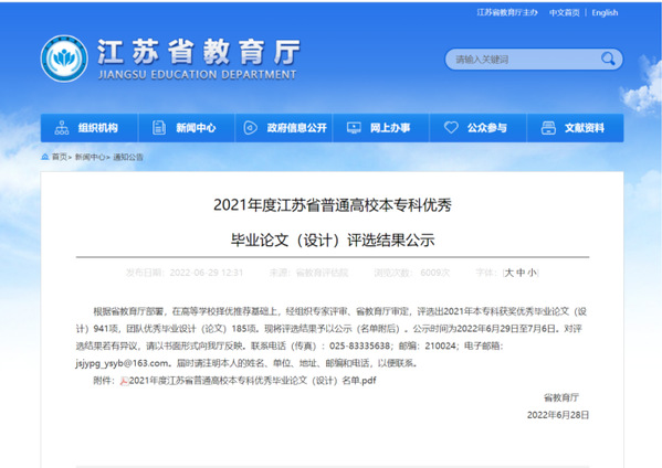近日,江苏省教育厅发布《2021年江苏省普通高校本专科优秀毕业设计(论文)评选结果公示》,东南大学线上赌博app 学院共获优秀毕业设计个人二等奖1个、三等奖2个、优秀毕业设计团队奖2个。