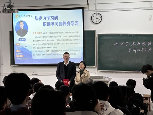 报告会中,胡继东副总裁从新技术发展尤其是Chat GPT正不断引发新一轮人工智能升级的角度,阐述了从校园学习到职场学习到终生成长的重要性,提出校企合作的重要作用,提出了一系列的问题,引发大家思考。胡继东副总裁介绍了作为技术部门负责人的专业技能要求,尤其是Chat GPT不断发展将对学校教育、软件设计等诸多行业、岗位将带来新的挑战和冲击,向大家介绍如何提升自身的技术辐射能力和抗压能力,对综合素质与大局观的培养进行了经验分享。并从中兴通讯面试官的角度出发,向学生们介绍一份高质量高标准的工作简历应该具备什么内容,提出作为面试官在面试时,会对学生各方面能力进行提问和评估。胡继东副总裁又介绍到面试成功入职后应该如何完成从学生到企业人员的职业化转变,强调第一次的反馈、总结、宣讲和转正答辩的重要性,指导学生如何在新单位存活并进步,不断提升自己的竞争力。同时向学生推荐了一些令自己印象深刻的书籍,提出坚持阅读的重要性,把阅读一本好书比作“与作者深入的心灵交流”。