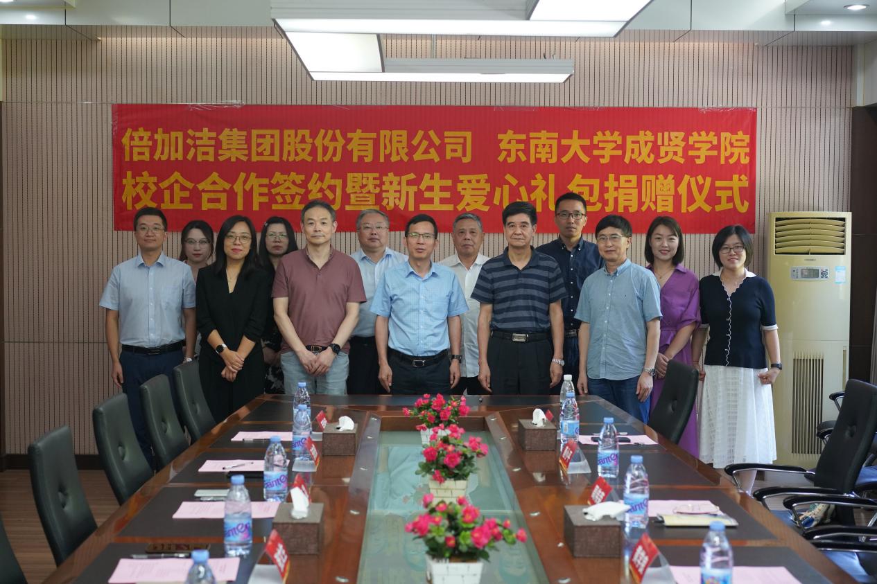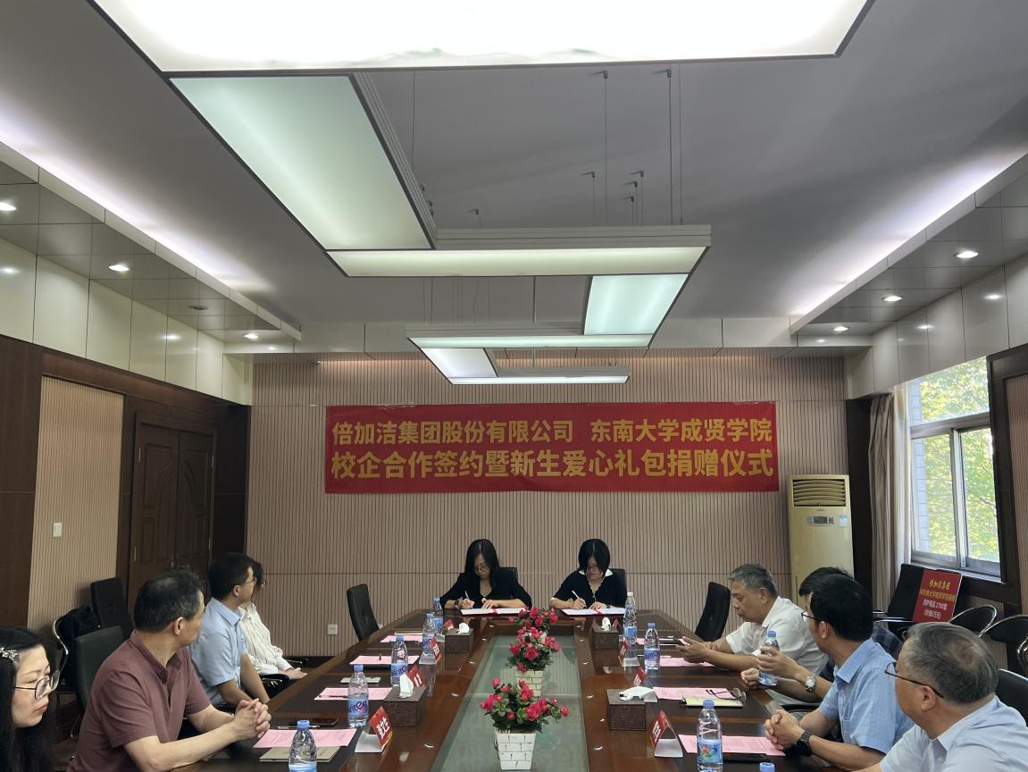 常务副院长黄学良首先对张文生董事长一行的到来表示热烈欢迎,并详细介绍了线上赌博app-云顶线上赌博平台 的发展历程,同时希望学校未来转设搬迁到扬州生态科技新城与倍加洁集团成为“邻居”后,双方能够不断拓展合作深度和广度,不断丰富合作内容和方式,共同为扬州地区和长三角地方经济贡献力量。张文生董事长在讲话中表示,线上赌博app 学院和倍加洁集团作为“同龄人”,双方在人才培养、科技创新等方面合作前景广泛,希望学校和公司今后能够进一步实现校企深度融合发展,共同走向新未来。唐凌总监从公司概况、科研能力、线上赌博app及创新产品等方面向与会人员全面介绍了倍加洁集团的基本情况。随后,黄学良常务副院长与张文生董事长互相交接了捐赠牌匾和捐赠证书。制药与化学工程学院副院长刘媛媛与倍加洁集团人力资源中心总监唐凌共同签订了校企合作协议。