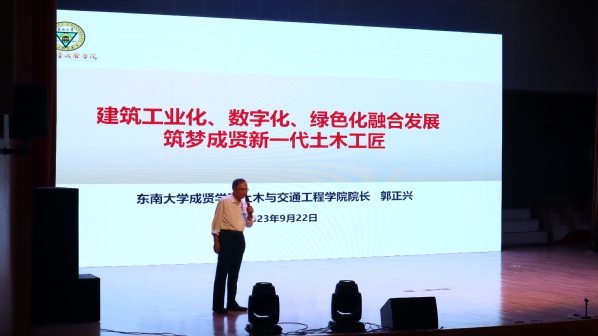 在第二篇章“勉悟精习”中通过聘任新生学生班导师指导、聘任新生班级班主任、聘任校友导师、聘任企业导师等环节集中阐述了土木与交通工程学院在学生价值引领工作中的七大创新举措即精神引领、朋辈引领、专业引领、德育引领、社会引领、榜样引领和旗帜引领。在朋辈引领环节中,土木与交通工程学院党总支书记杨阳为10名2023级新生学生班导师颁发聘书。在专业引领环节中,土木与交通工程学院常务副院长郭应征为10名2023级新生班主任颁发聘书。随后,土木与交通工程学院院长郭正兴为土木与交通工程学院2023级新生带来了精彩的开学第一课教育。郭正兴院长从“工业化、信息化、绿色化”建筑行业三化融合发展的角度生动讲述了行业发展的新需求和新技术并以自身的实践与经历增强了同学们对未来土木行业发展的信心,希望同学们在未来能够掌握更多的技术与技能,成为多样化人才。