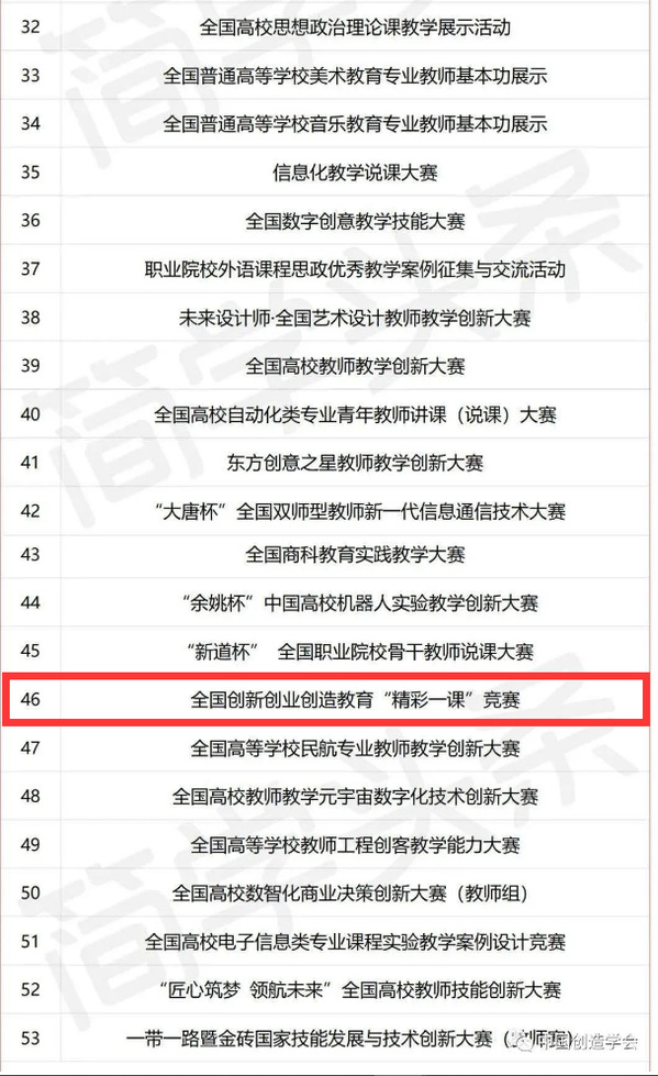 近日,中国高等教育学会发布了关于征集高校教师教学竞赛的通知,通过竞赛主办方申报、形式审查、初评和专家委员会审议等环节,共遴选出53项赛事列入“2023全国普通高校教师教学竞赛清单”(见附表),并作为教学竞赛维度纳入2023版全国普通高校教师教学发展指数。由中国创造学会主办,中国创造学会创新创业创造专业委员会、线上赌博app-云顶线上赌博平台 等高校共同承办的“全国创新创业创造教育‘精彩一课’比赛”位列其中(序号46)。