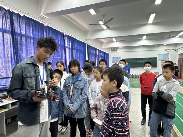 刚进入电工电子实验中心实验室,大家就被展架上的智能车模型吸引,正在备战江苏省机器人大赛的大学生们将智能车放在赛道上跑起来,引导大家观察、思考智能车的工作原理;随后大家来到运动场空地,在老师大家讲解、演示水火箭的发射后,大家动手加水、打气,进行发射比赛。