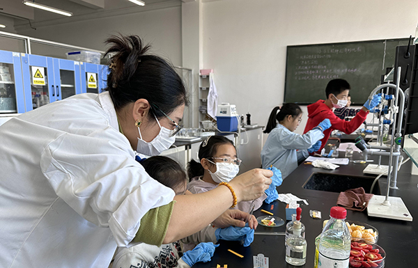 在制化学院实验室,老师从身边常见的现象为切入点,带领“小工程师”们探索化学的奥秘。首先,老师演示了“黑面包”实验,大家通过观察、触摸,了解了浓硫酸脱水的原理;随后,老师带领孩子们进行了水果、饮料的酸碱度测定,大家认真比对PH试纸,记录实验数据,老师引导大家选择健康的饮料,爱护牙齿。