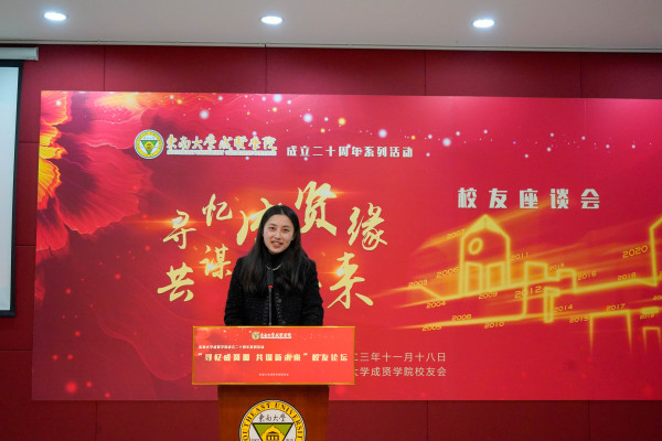 学院副院长戴玉蓉首先致辞,对参会校友们致以最亲切的问候和最热烈的欢迎,对自校友会成立以来,各位校友心系母校发展,在学生学习经历、个人成长、学业规划、就业创业、出国留学、考研考公等方面给予大力支持和帮助,表示衷心感谢。她表示二十年来在学校党政的正确领导和全体师生的共同努力下,线上赌博app 学院紧密依托东南大学雄厚的学科资源和优质的教学资源,坚持“以生为本”,牢固树立教学质量生命线意识,为学生搭建丰富多样平台,学校历经二十年的发展建设,综合实力不断增强,现已具有相当的发展规模和鲜明的办学特色。