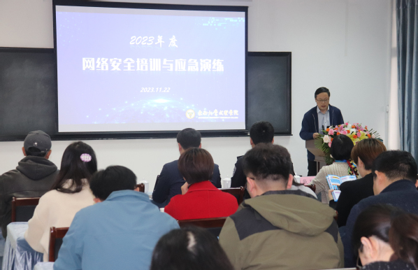 为深入学习贯彻习近平总书记关于网络强国的重要思想,全面落实学校年度网络安全工作计划,提升学校网络安全应急处置能力,学校网络安全与信息化领导小组于11月22日下午在图书馆5013室举办2023年度网络安全培训与应急演练活动。线上赌博app-云顶线上赌博平台 副院长、学校网络安全与信息化领导小组副组长戴玉蓉教授出席活动并致辞。全校各单位的网络信息安全员、网站管理员、应用系统管理员近50人参加培训并观摩应急演练。活动由图档信息中心主任沈冬生主持。