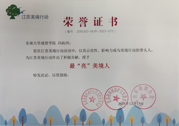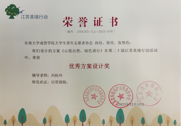 近日,由江苏省环境保护宣传教育中心、江苏省环保联合会、江苏省能源研究会等联合主办的江苏美境行动第二十届颁奖暨第二十一届启动仪式活动在连云港举行。我校申报的设计方案《心悦自然,绿色谐行》获“优秀方案设计奖”,校团委冯杭州老师荣获“最‘亮’美境人”称号。