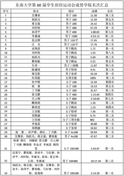 在4月14日结束的东南大学第六十届学生田径运动会中,我院运动健儿团结协作、奋勇拼搏,获得男女团体总分第二名,男子团体总分第二名,女子团体总分第二名的好成绩(获奖名单附后)。在此,特向全院师生报喜,并向全体获奖运动员表示热烈的祝贺!