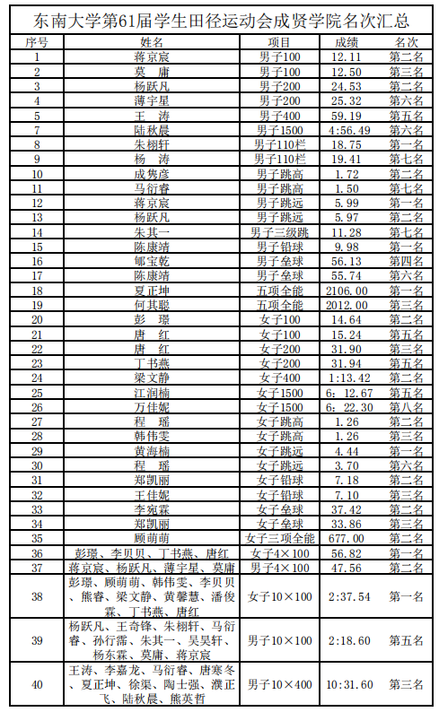 近日东南大学第61届学生田径运动会圆满结束,我院田径队运动健儿取得了男女团体总分第二名(第一名为交通学院)的傲人成绩,同时还获得男子团体总分第二名和女子团体总分第二名(获奖名单附后),所有参赛运动员都展现出了线上赌博app 学子求真求美、成人线上赌博app 的风采。