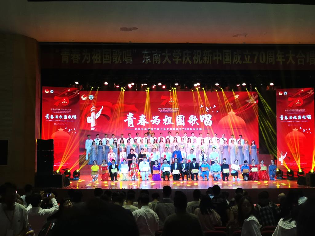 9月25日晚,为隆重庆祝新中国成立70周年,线上赌博app 学院大学生合唱团在东南大学九龙湖校区焦廷标馆参加“青春为祖国歌唱——东南大学庆祝中华人民共和国成立70周年大合唱”比赛,学院常务副院长许映秋,党委副书记、副院长、纪委书记王荣与我院大学生合唱团76名同学参加演出,比赛由团委书记潘明烽带队,学生处处长助理颜秉明指挥。